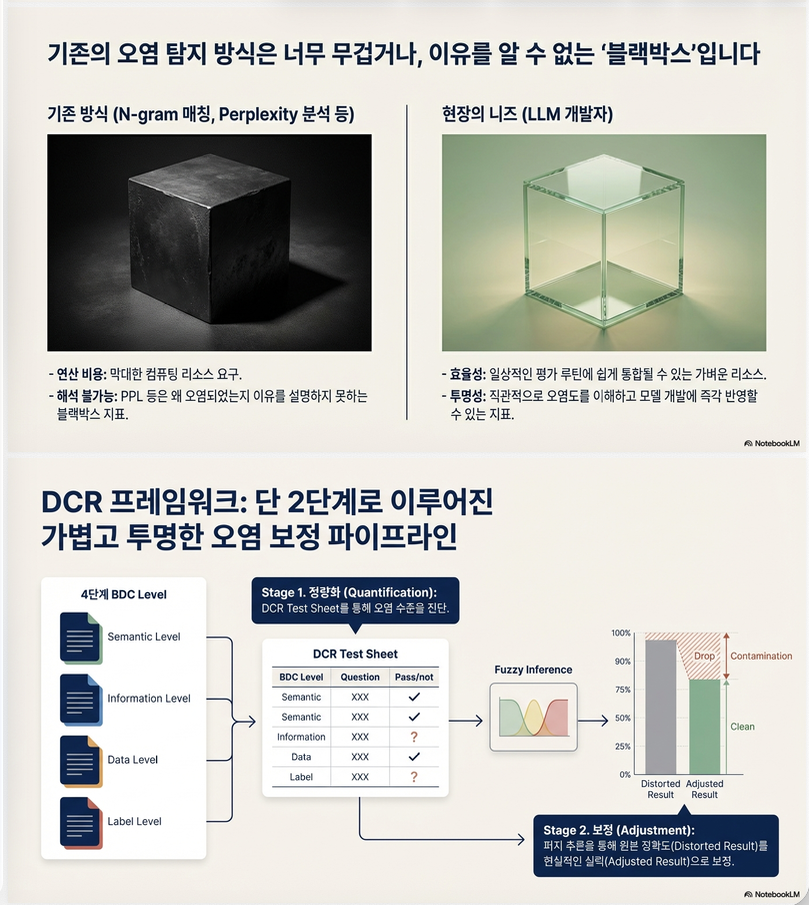이 논문은 LLM 평가에서의 Benchmark Data Contamination (BDC) 문제를 정량적으로 측정하고, 오염을 반영하여 성능을 보정하는 DCR (Data Contamination Risk) 프레임워크를 제안합니다.