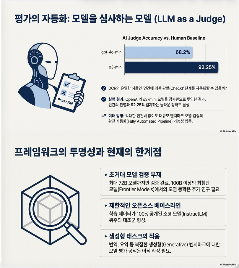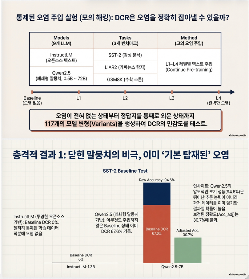 본 논문은 DCR 프레임워크가 실제로 contamination을 감지하고 성능을 보정할 수 있는지를 검증하기 위해 contamination injection 실험을 수행했습니다
