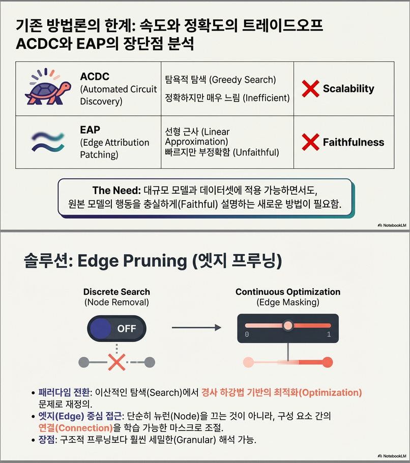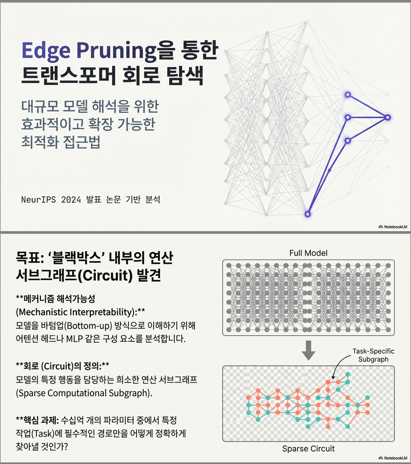 아래는 논문 **“Finding Transformer Circuits with Edge Pruning (NeurIPS 2024)”**의 핵심 내용을 직관적으로, 기존 ACDC/EAP과의 차이를 중심으로, 수식·개념까지 포함해 정리한 설명입니다.