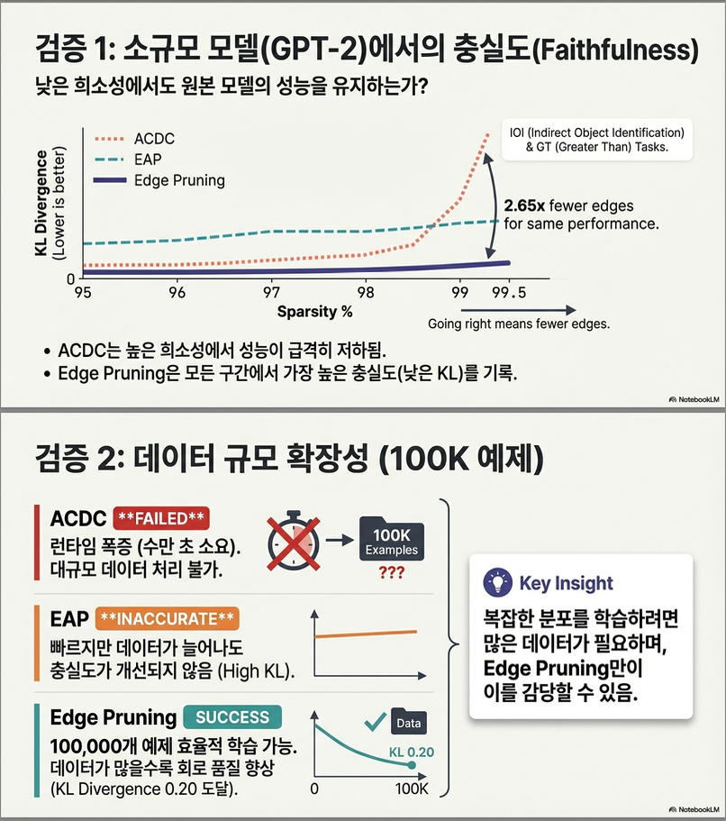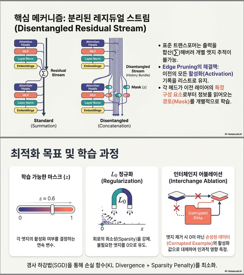 | Edge Pruning | continuous edge mask + gradient + L0 | 정확 + 빠름 + scalable | 메모리 요구량 큼 (disentangled stream 필요) |
