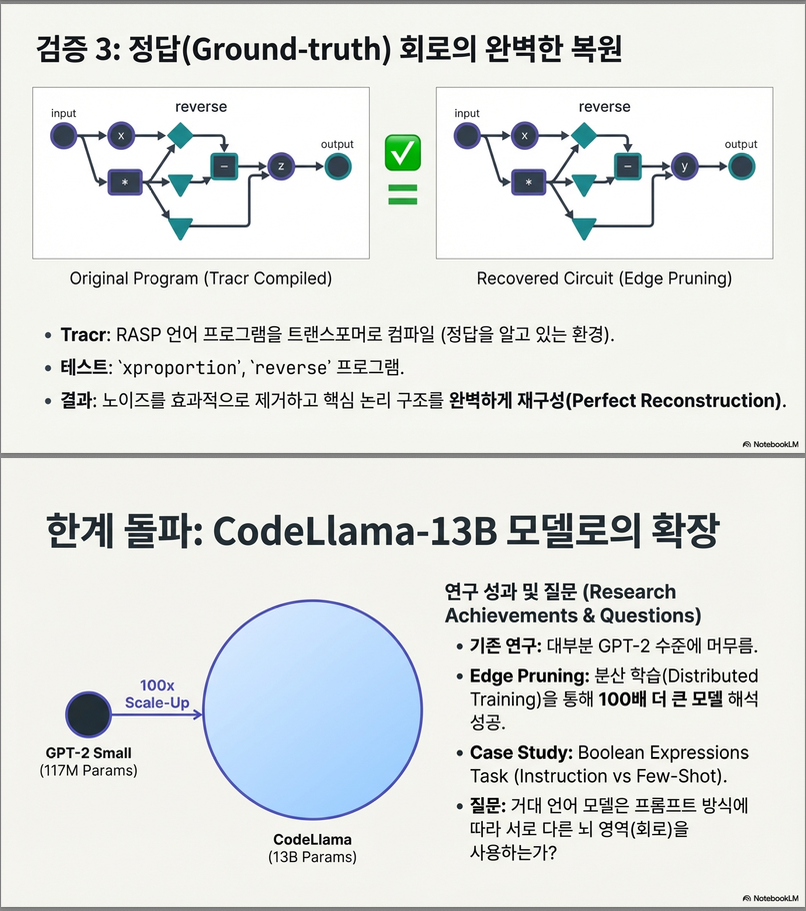 - 대규모 모델(13B)에서도 미세한 회로 추출 가능