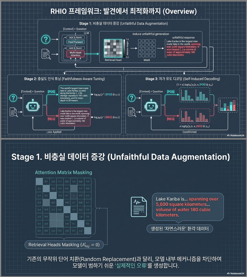 요약하자면, RHIO는 “retrieval head 마스킹 → 비충실 샘플 생성 → 충실성 인식 학습 → 대조 디코딩 강화” 의 단계로 LLM의 문맥적 신뢰도를 내재적으로 향상시키는 새로운 접근입니다.