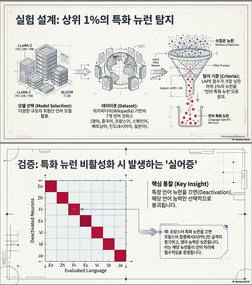 이 논문 **「Language-Specific Neurons: The Key to Multilingual Capabilities in Large Language Models」 (ACL 2024)**은 대형 언어 모델(LLM)의 다국어 능력이 **특정한 언어 전용 뉴런(language-specific neurons)**에 의해 어떻게 형성되는지를 정량적으로 규명한 연구입니다 .