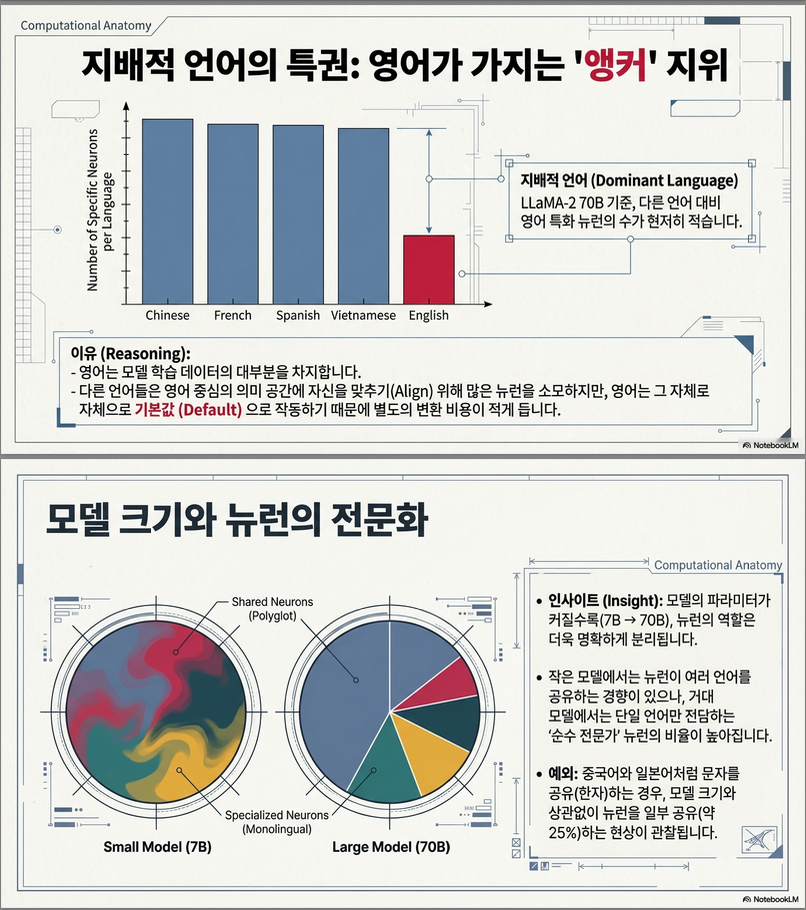 - 이러한 뉴런은 언어별로 상이하게 분포하며, 모델의 크기와 학습 데이터 구성에 따라 다르게 형성된다.