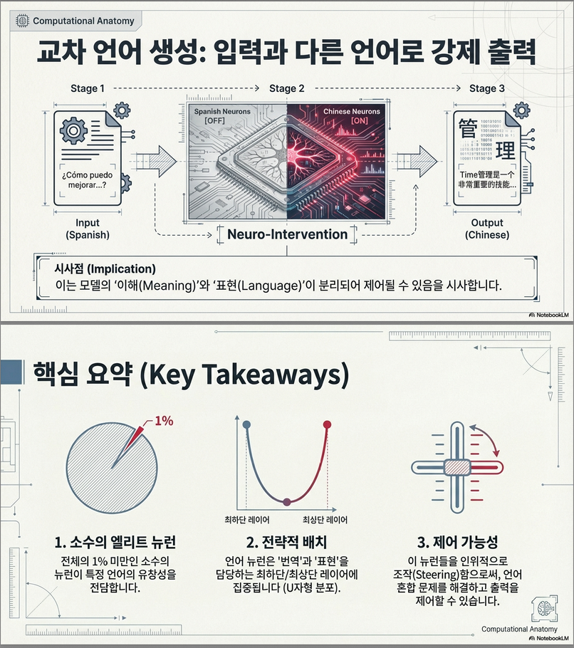 - 결과: 유창한 중국어 응답 생성 → 뉴런 조작을 통해 출력 언어를 자유롭게 전환 가능.