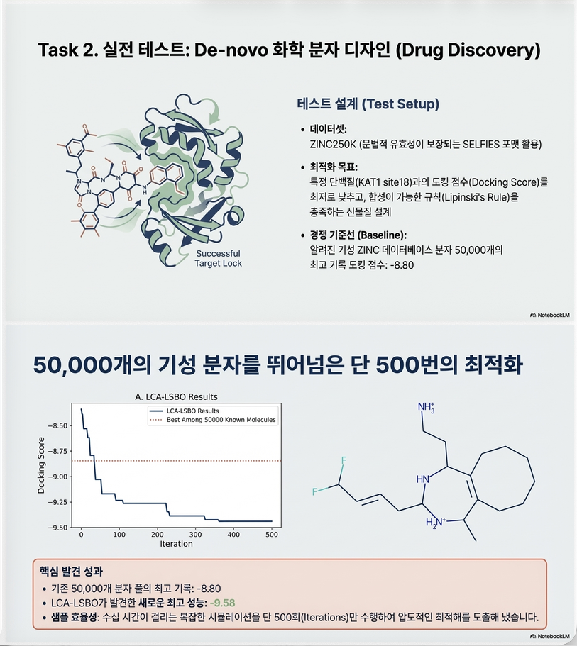 결과: 500 evaluations 만으로 50k random search보다 좋은 molecule 발견