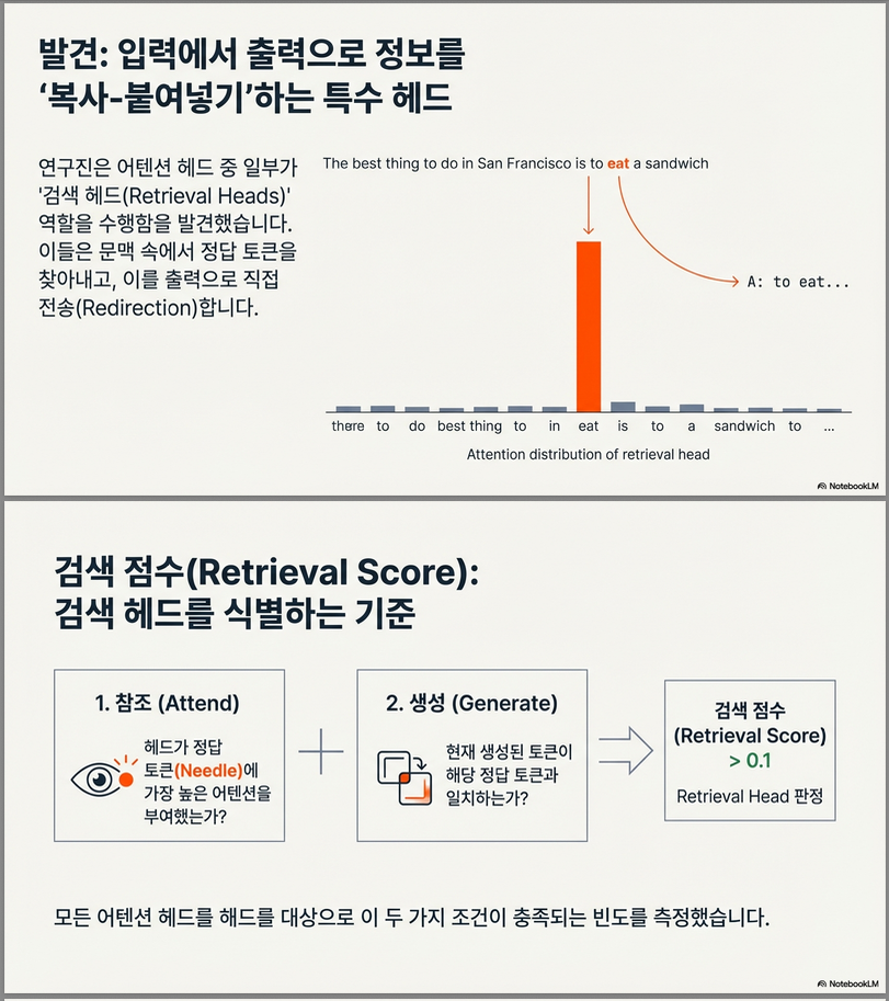 Transformer의 소수의 특정 attention head가 입력의 특정 토큰을 **조건부 복사(copy-paste)**하여 출력으로 직접 전달하는 역할을 하며, 이것이 장문 사실성의 원인이라는 가설을 제시한다. 이들을 Retrieval Head라 명명.