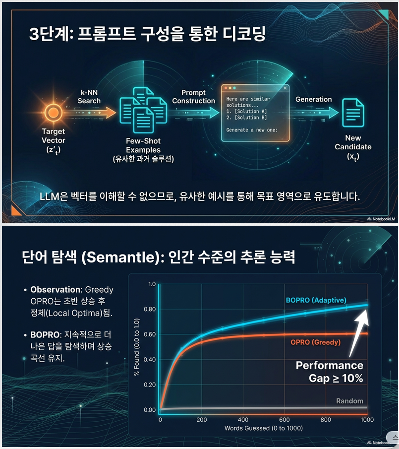 - BO가 제안한 latent vector 주변을 LLM이 생성하도록 프롬프트 구성
