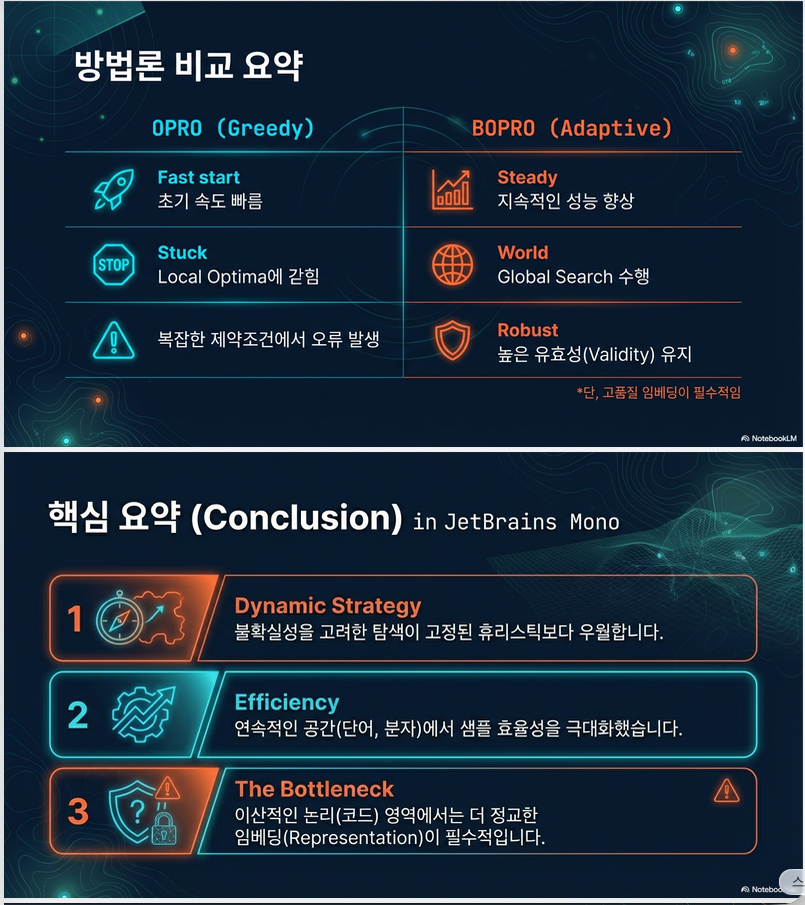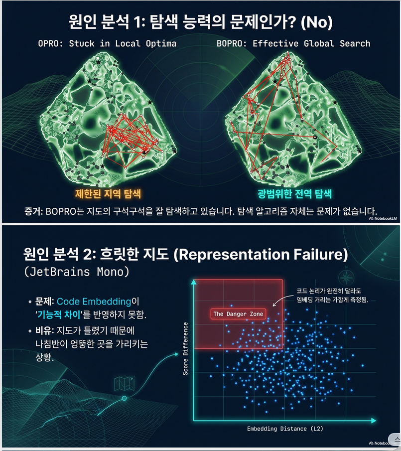 | Greedy OPRO | exploitation 위주 → local optima에 갇힘 |