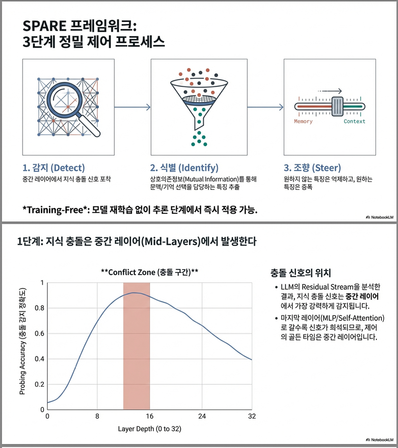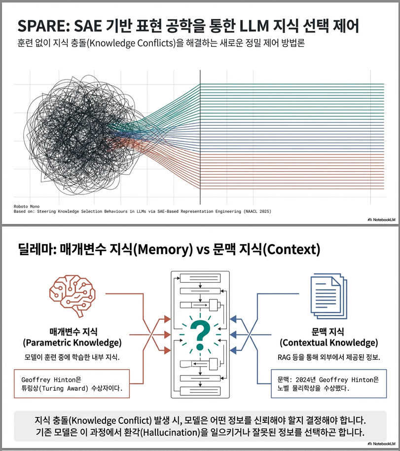 SPARE는 SAE 기반 feature-level editing을 처음으로 context-memory conflict resolution에 적용한 연구로,