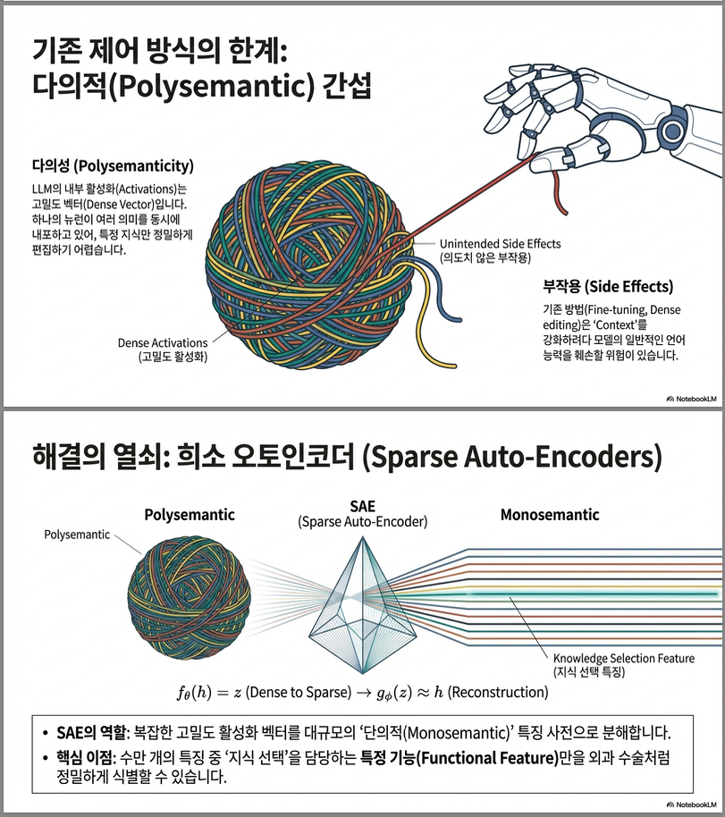 LLM 내부의 hidden representation은 다의적(polysemantic)이라 직접 편집하면 여러 의미가 얽혀 불안정합니다.