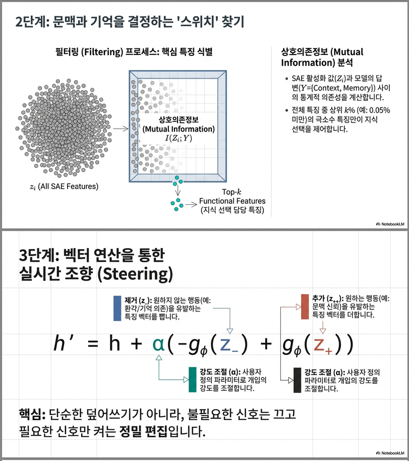 | Step 3. Representation Editing (Steering) | 입력 hidden state의 SAE representation을 부분적으로 수정 | inference 시 특정 지식 방향으로 steering |