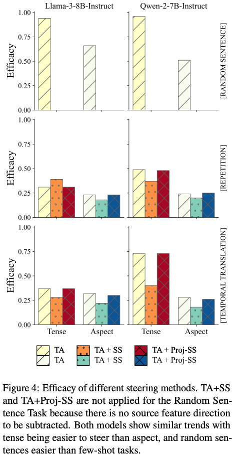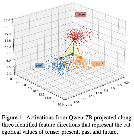 - LLM은 시제와 상을 구조적으로 구분하여 인코딩 하며, 서로 거의 독립된 하위공간으로 표현함.