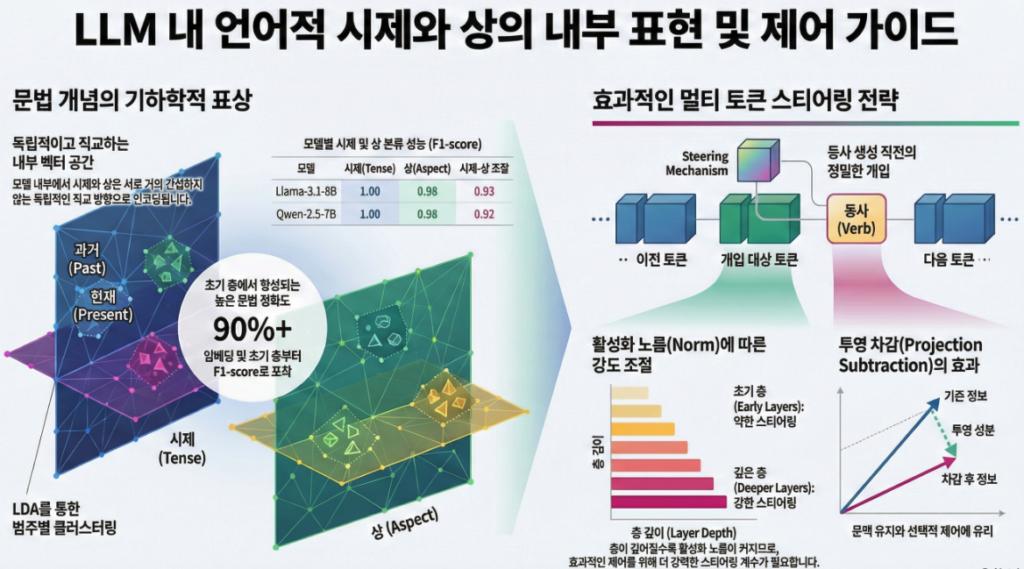 이 논문 “Steering Language Models in Multi-Token Generation: A Case Study on Tense and Aspect” (EMNLP 2025) 은 LLM 내부 표현에서 시제(tense) 와 상(aspect) 이 어떻게 구조적으로 표현되고, 이를 multi-token 생성 과정에서 조절(steering) 할 수 있는지를 체계적으로 분석한 연구입니다 .